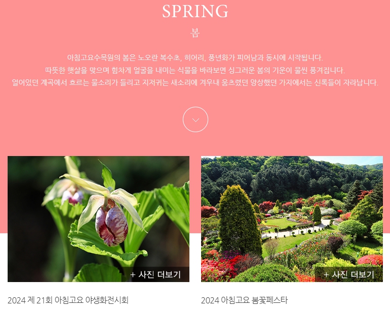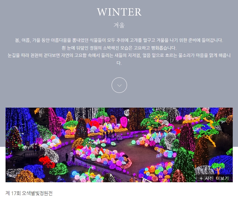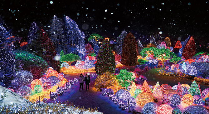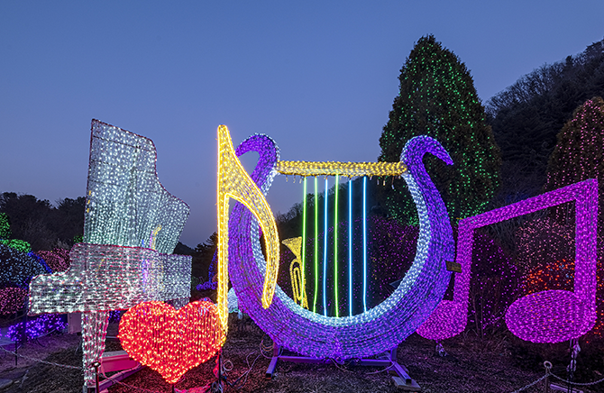 아침고요수목원은 5,000여 종의 식물을 관람할 수 있는 정원으로 22여 개의 특색 있는 주제 정원으로 이루어져 사계절 모두 아름다워 사랑을 많이 받고 있는 수목원입니다. 겨울의 추위를 잊을 만큼 아름다운 빛 축제~! 도시에서 느끼는 아름다움과 또 다른 아름다움을 느낄 수 있습니다.