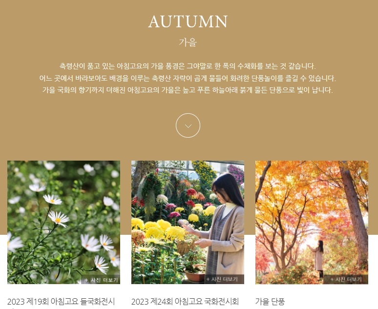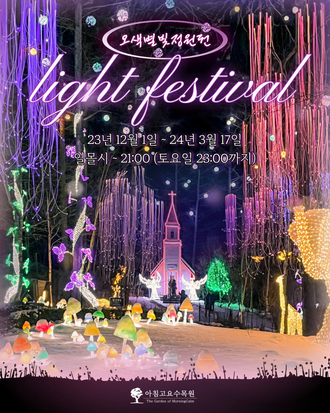23년 제17회 아침고요 '오색별빛정원전'은 10만여 평의 야외 정원 곳곳을 다채로운 조명과 빛을 이용하여 특별한 주제를 가지고 표현한 야간 조명 점등행사입니다. 사랑, 동물, 식물 등 다양한 테마로 구성되어 있습니다.