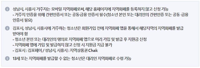 지원금이 지역화폐로 지급되기에 지원금을 받을 청소년 또는 대리인은 해당지역의 지역화폐를 등록해야 합니다. 만 13세 또는 휴대폰이 없거나 지역화폐 App을 설치할 수 없는 휴대폰을 이용하는 청소년의 경우에는 대리인 지역화폐로 신청가능합니다.