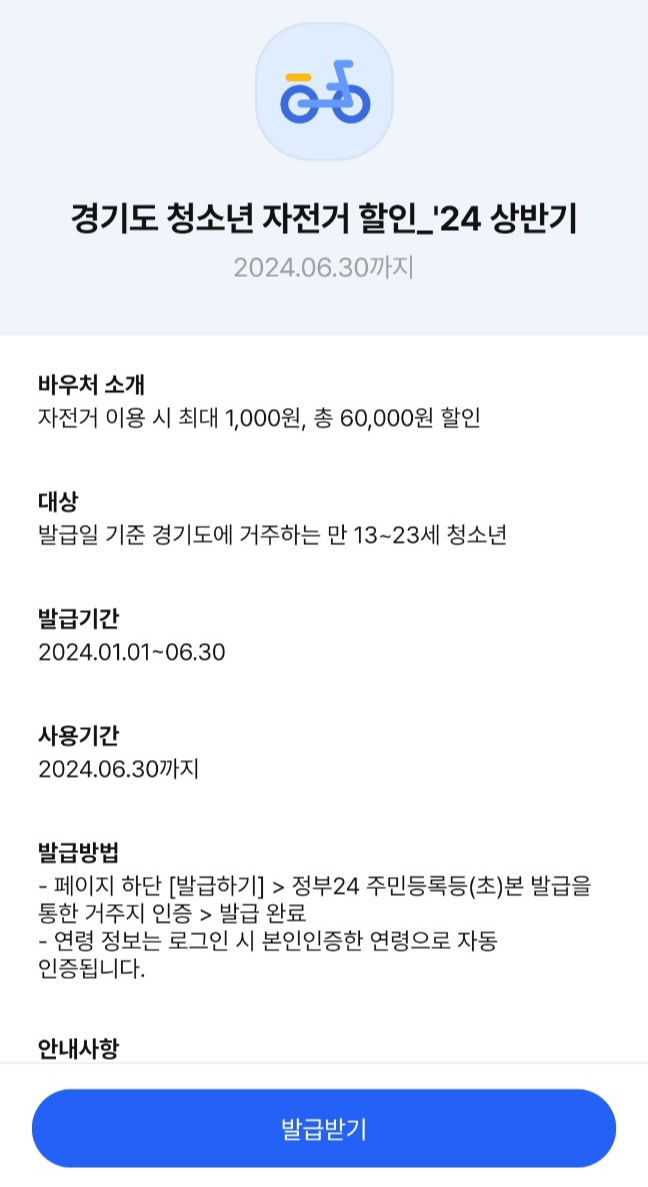 - 똑타 앱 설치 후 실행 > 목록보기 > 복지바우처 > 경기도 청소년 자전거 할인_'24 상반기 클릭