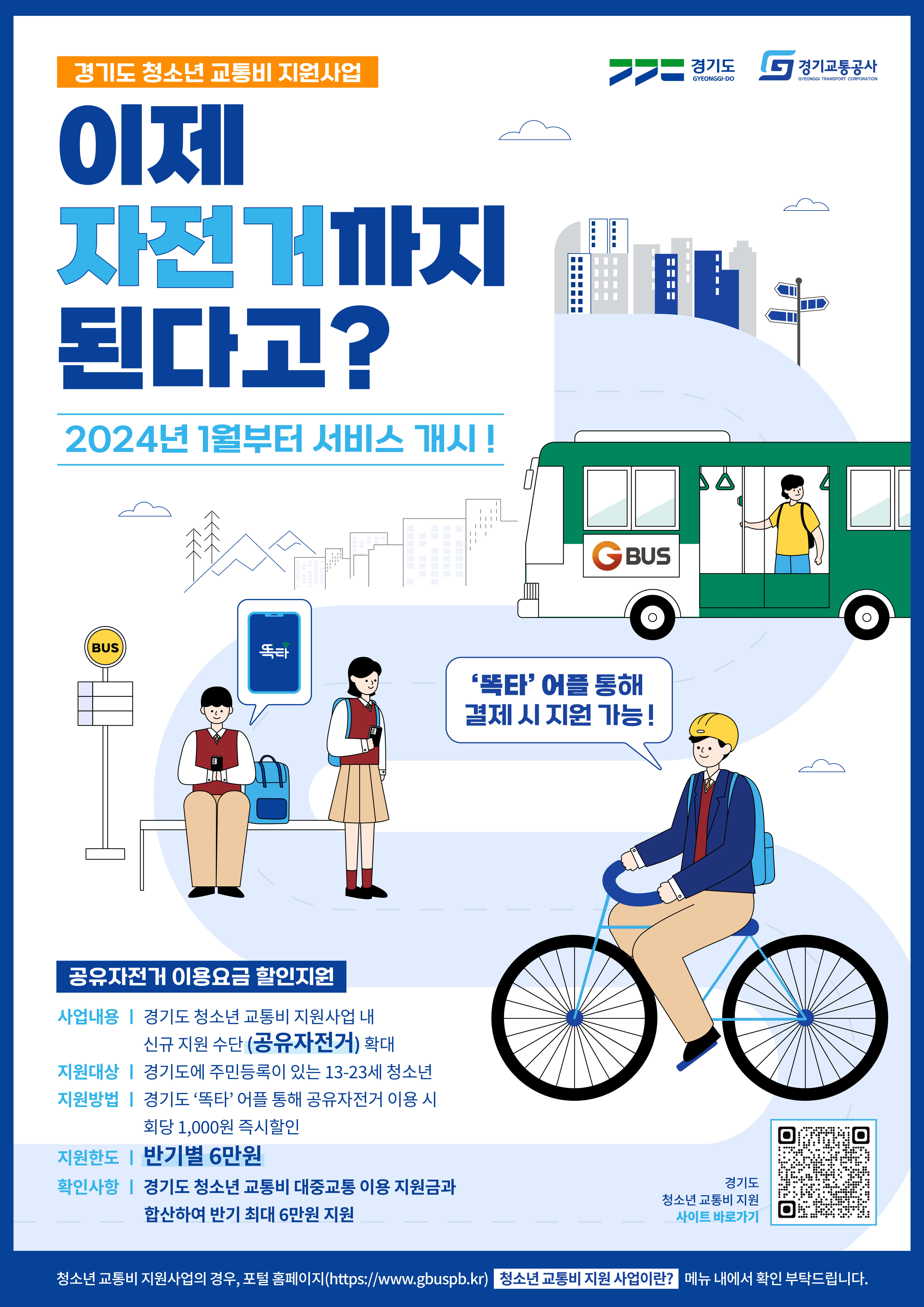 경기도 청소년 교통비 지원사업에서 공유자전거를 신규 수단으로 확대하여 실시한다고 합니다.