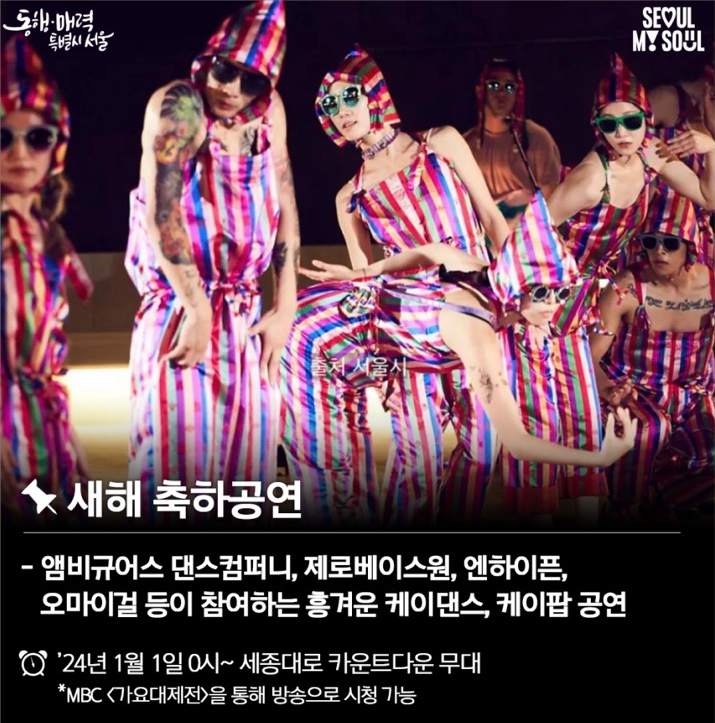 먼저 보신각 타종 전, 약 40분간(23:00~23:40) 퓨전 국악그룹 ‘S.O.S(Season of Soul)’이 출연하여 사전공연을 시작으로 깃발 퍼포먼스, 탈놀이와 북청사자놀음, 농악놀이패 거리공연(퍼레이드)이 열린다고 하니 다양한 볼거리도 놓치지 말고 관람하시기 바랍니다.