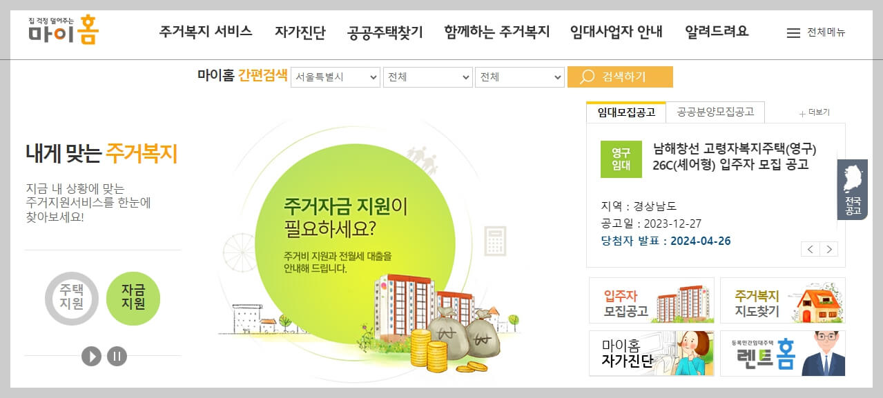 마이홈 홈페이지에서는 내가 원하는 지역을 선택하면 그 지역에서 받을 수 있는 복지정책을 확인할 수 있습니다.