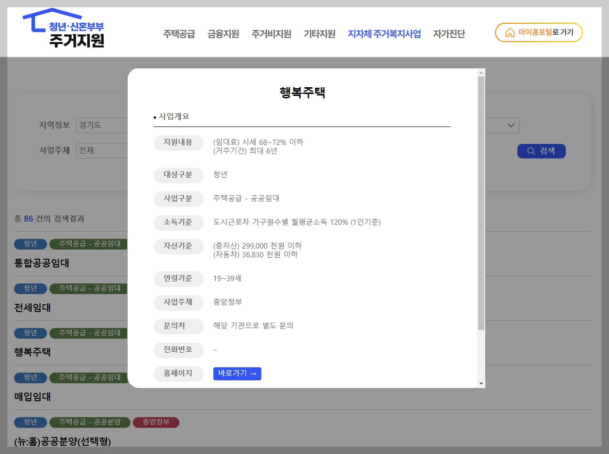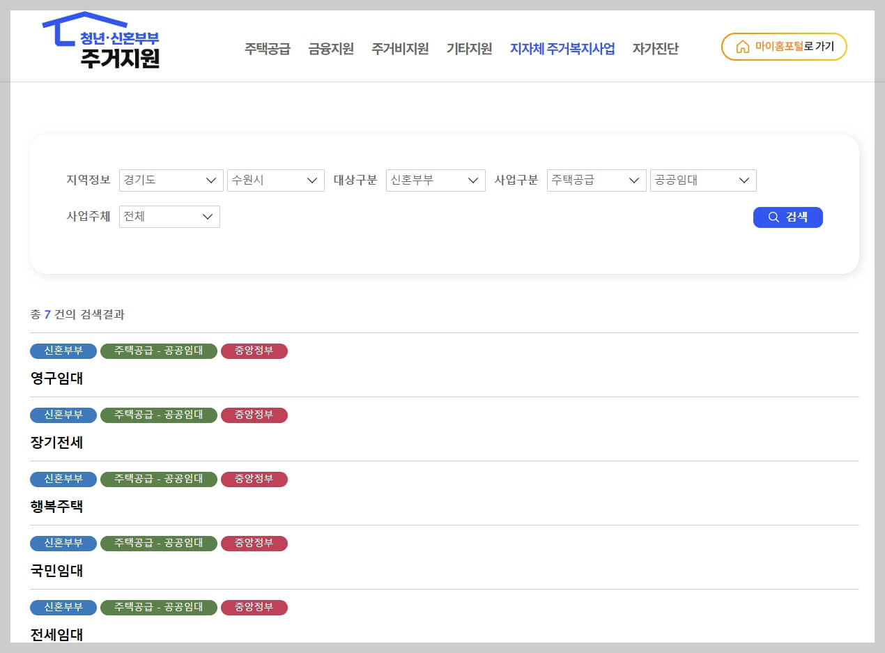 청년 신혼부부 주거지원 마이홈 홈페이지