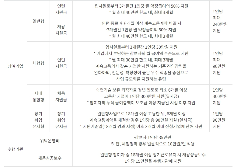 3개월간 인턴십 참여 후 계속 근로계약 체결 시 1인당 최대 240만 원 인건비를 지원합니다.